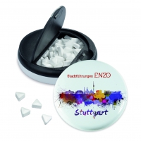 Pepermint pastile Mint-Bizz® v domiselni kovinski škatlici s plastičnim pokrovom. MINIMALNA KOLIČINA JE 30O ŠKATLIC. Za atraktivni dotisk vašega logotipa lahko izbirate kar med štirimi različnimi tehnikami tiska in sicer digitalni barvni tisk, tampotisk 1 do 4 barve, laserski tisk ali gravura.